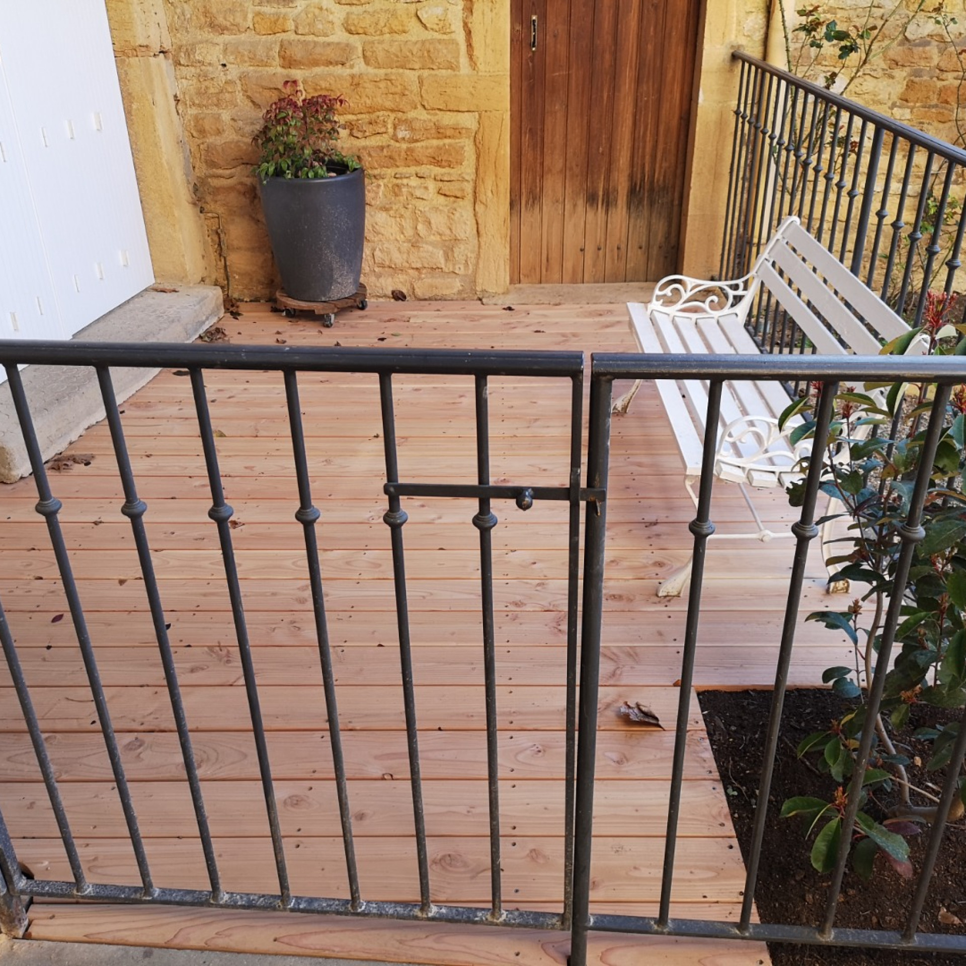 - après décapage et évacuation du gravier existant sur 10cm, pose sur chevrons en pin autoclave Classe IV de lames de terrasse (27x145) en Douglas non traité avec visserie Inox apparente